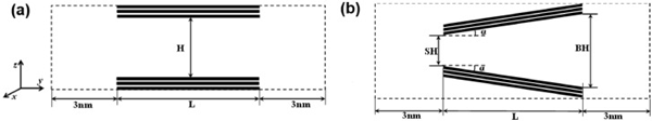 狹縫孔由半有限狹縫孔由兩個平行的石墨壁組成。每個壁包含三個石墨烯層,如圖1(a)所示?虻奶摼表示模擬框在y和z方向上的邊界。周期性邊界條件僅適用于x方向。兩個開口端與大塊氣藏相連,每個氣藏沿y軸的長度為3nm,孔隙寬度決定了z方向的尺寸。因此,通過孔內(nèi)分子與體相的相互作用,可以在孔和周圍環(huán)境之間保持機械平衡?讖紿是指通過一個壁最內(nèi)層中碳原子中心的平面與相對壁的相應(yīng)平面之間的距離。楔形孔在圖1(b)描繪了一個開放的楔形孔及其結(jié)構(gòu)參數(shù):小端(SH)和大端(BH)的孔徑,軸向孔長(L)和半角(α)?虻奶摼表示模擬框在y和z方向上的邊界。與狹縫孔一樣,開口端周圍的氣體沿y軸的長度為3nm,大端的寬度決定了z方向的尺寸。沿軸向(即,y方向)的孔長度是有限的L,而在x方向上的尺寸在應(yīng)用周期性邊界條件的情況下假定為無限。