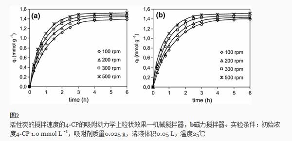 可以看出,吸附速率受攪拌速度的影響很大 - 吸附速率隨攪拌速度顯著增加。隨著攪拌速率從100rpm增加到500rpm,k 2值分別從0.577增加到1.264g mmol -1 h -1(機(jī)械攪拌器)和0.560-1.231g mmol -1 h -1(磁力攪拌器)。在相同的攪拌速度下,機(jī)械攪拌器和磁力攪拌器之間的差異沒有統(tǒng)計(jì)學(xué)意義(p > 0.05)。隨著攪拌速度的提高,4-CP分子從大塊液體向活性炭顆粒周圍的液體邊界層擴(kuò)散的速率變得更高,這是因?yàn)槲闪鞯脑鰪?qiáng)和液體厚度的減小邊界層。隨著攪拌速度的增加,吸附劑顆粒破碎的程度增加,這種效果可能會進(jìn)一步增強(qiáng)。在這些研究中,試驗(yàn)前和試驗(yàn)后的吸附劑的顆粒大小沒有測定,但在4-CP的吸附動(dòng)力學(xué)的活性炭的粒子大小的影響是有據(jù)可查的。還描述了攪拌速度吸附率的增加為堿性染料的吸附上活性白土[ 6 ]以及乙酸,吡蟲啉和4-氯苯酚在活性炭上。