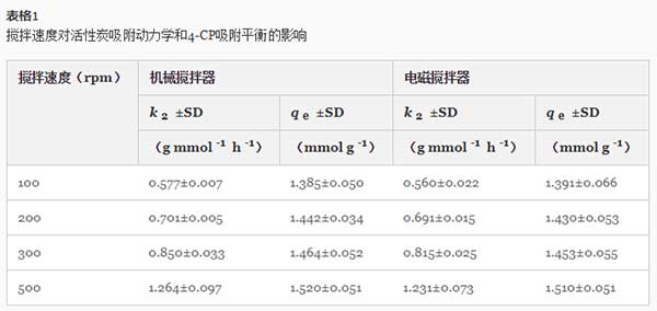 表1中的數(shù)據(jù) 也表明,攪拌速率不僅影響吸附動(dòng)力學(xué),而且影響4-CP從水中的去除效率。吸附容量從1.385增加到1.520 mmol·g -1(機(jī)械攪拌器)和從1.391增加到1.510 mmol·g -1(磁力攪拌器),攪拌速度從100增加到500rpm。觀察到從20.06 4-CP的吸附容量的增加至23.04毫克克-1攪拌速度從300到600轉(zhuǎn)。然而,一些作者已報(bào)道,用增加攪拌速度只能達(dá)到一定的限度,超過此有在吸附容量無顯著增加吸附增加。在一些情況下,觀察到在更高的攪拌速率在吸附容量的降低。正如作者所提出的,這是由于這樣一個(gè)事實(shí),即在非常高的攪拌速度下,吸附分子和吸附劑顆粒的動(dòng)能增加到足以使它們相互碰撞而導(dǎo)致分離松散結(jié)合的吸附分子。