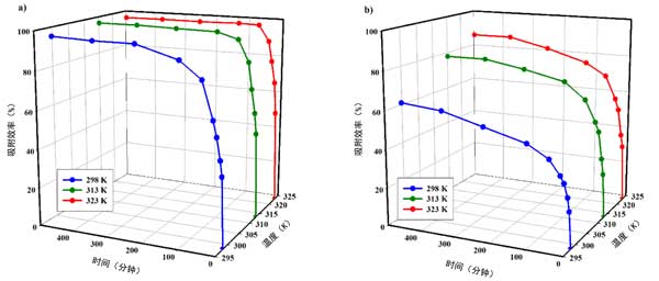 圖2:吸附效率隨時間和溫度的變化:(a)銅(b)鋅。