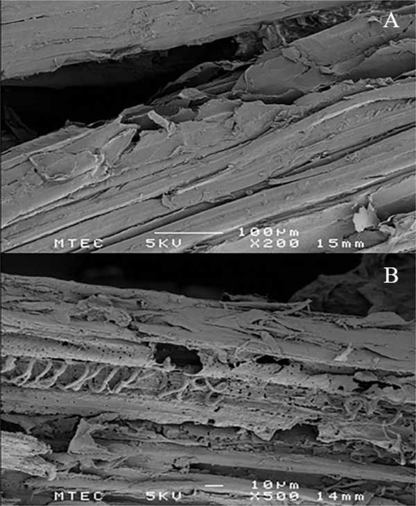 如圖3所示,將通過分離獲得的固相微結(jié)構(gòu)通過SEM與天然RH進(jìn)行了比較。活性炭原材料提供了正常且完整的表面,表明植物材料的高度有序的完整結(jié)構(gòu)(圖3A)。分離的固體殘余物的生物質(zhì)的表面結(jié)構(gòu)顯示出表面和內(nèi)部結(jié)構(gòu)的破壞,并具有空腔和裂紋。該觀察結(jié)果表明半纖維素的去除和表面木質(zhì)素的改變。對于BET表面積測量,分析了原始和預(yù)處理的生物量樣品。