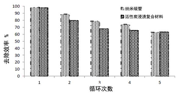 活性炭復(fù)合材料的再生具有經(jīng)濟(jì)重要性。該實(shí)驗涉及許多吸附-解吸循環(huán),以估計重復(fù)脫色對納米材料吸附效率的影響。發(fā)現(xiàn)納米碳管和活性炭浸漬材料對活性紅的去除效率略有變化,如圖3所示。數(shù)據(jù)顯示原始納米碳管和活性炭浸漬材料存在差異與不同初始活性紅染料濃度下重復(fù)使用的納米化合物相比;钚约t的吸收程度在第一個循環(huán)后達(dá)到98.18%,然后在五輪納米碳管后降低到62.72%,而對于活性炭浸漬材料,第一個循環(huán)去除效率為97.72%,在第一個循環(huán)后,在五輪后降低到63.18%,表明其再生有效性,如圖3所示。因此,可以得出結(jié)論,納米碳管和活性炭浸漬材料的吸附過程會受到延長重復(fù)使用周期的影響,而不會損失大量染料吸附能力。因此,兩種納米化合物被多次用于從水性階段去除活性紅染料。因此,這表明它們可以多次使用,證明了它們的經(jīng)濟(jì)可行性。