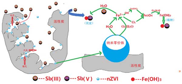 圖3:鐵改性活性炭加過氧化氫在系統(tǒng)中發(fā)生的主要反應(yīng)以及銻(III)的氧化和螯合機(jī)制的說明。