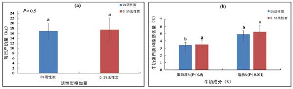 圖2:(a)活性炭對每日產奶量(kg)的影響,(b)乳蛋白和脂肪(%)。