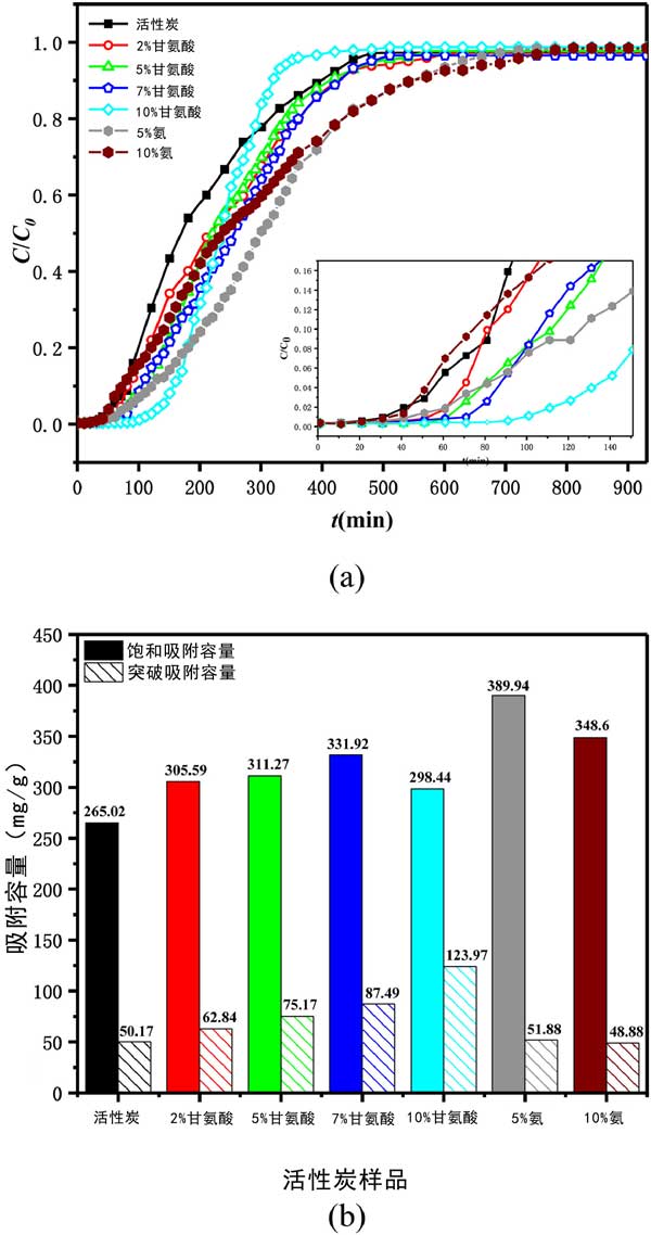 測試了選定的甲苯VOC對活性炭的吸附性能。在每個實驗運行中,甲苯通過裝有活性炭的吸附管直到達到平衡,即活性炭吸附劑被甲苯飽和。圖2(a)所示的穿透曲線呈現(xiàn)為甲苯吸附量吸附(ç/ç0)與接觸時間(噸,分鐘)六種的活性炭正在進行中,它們的飽和和突破吸附容量如圖2所示(b)。從吸附曲線可以看出,甘氨酸修飾的活性炭的穿透時間明顯延長,而飽和氨改性活性炭的時間延長;钚蕴可霞妆酱┩肝侥芰Φ捻樞驗10%甘氨酸改性活性炭>7%>5%>2%>5%氨改性活性炭>未改性活性炭>10%氨改性活性炭,而活性炭對甲苯飽和吸附容量的順序如下:5%氨改性>10%>7%甘氨酸改性>5%>2%>10%>未改性活性炭?梢姼拾彼嵝揎棇妆轿接酗@著的正向影響。與原來的AC相比,甘氨酸改性的活性炭對甲苯的突破吸附能力分別提高了25%、50%、74%和147%,隨著甘氨酸濃度的增加呈上升趨勢。同時,甘氨酸改性的活性炭對甲苯的飽和吸附容量分別增加了15%、17%、25%和13%,且隨著甘氨酸濃度的增加先增加后減少。5%和10%的氨改性也提高了甲苯的吸附性能,但其優(yōu)勢主要體現(xiàn)在飽和吸附容量上,與原來的活性炭相比,分別提高了47%和32%。