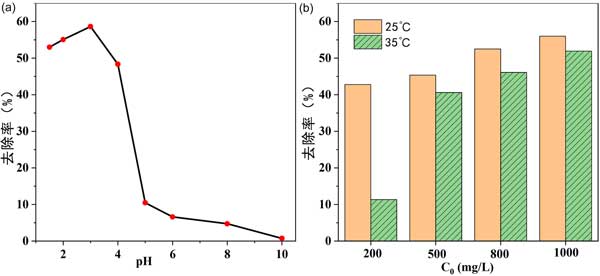溫度也影響吸附過程?疾炝瞬煌瑴囟认虏煌瑵舛却姿崛芤旱奈竭^程,其他條件不變。結(jié)果如圖2(b)所示。對于不同濃度的乙酸稀釋劑,25℃時的吸附去除率高于35℃時的吸附去除率,表明吸附過程是放熱的。因此進一步的實驗僅在25℃下進行。對于工業(yè)應用,室溫條件是可行的,無需提供額外的熱源。