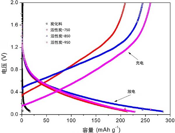充放電曲線評(píng)估了活性炭的的電化學(xué)性能,不同溫度活化的活性炭電極如圖3所示。CD測(cè)試是在0.25C的電流密度速率下進(jìn)行的;罨瘻囟忍岣吡顺潆娙萘俊;钚蕴繕悠返母叱潆娙萘繛260.36mAh/g-1,而炭化料樣品的低充電容量為1.98mAh/g-1。這是因?yàn)榛罨臉悠房梢晕蘸芏嗟匿囯x子。放電曲線顯示三個(gè)不同的電位區(qū)域,這可能歸因于不同的機(jī)制。0到0.12V的區(qū)域?qū)?yīng)于鋰離子從隨機(jī)取向的小分子堆疊中的微孔中脫出。0.12到0.8V的區(qū)域歸因于鋰離子從無(wú)序石墨烯層中脫出。高于0.8V的區(qū)域?qū)?yīng)于鋰從各種邊緣位置或石墨烯層中含H-/O官能團(tuán)的脫嵌。