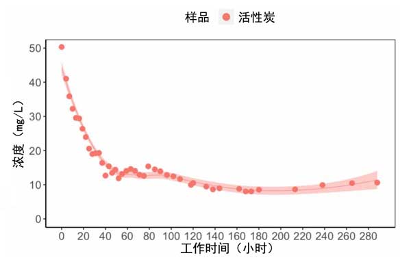 圖2:運(yùn)行期間主體相中動力活性炭濃度的變化。