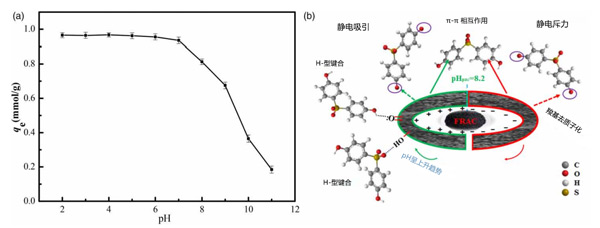 圖4:(a)pH值對活性炭吸附雙酚S容量的影響,(b)雙酚S在活性炭上的吸附機制。
