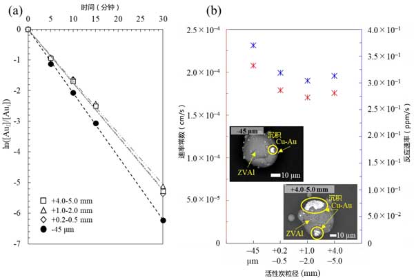 圖2:(a)活性炭尺寸對金離子回收率的影響,以及(b)鋁和活性炭在硫代硫酸銨體系中通過電偶相互作用進(jìn)行的膠合反應(yīng)的速率常數(shù)/速率與活性炭尺寸的關(guān)系圖(注意,反應(yīng)速率為負(fù)值)。