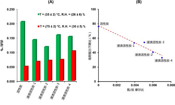 甲基碘吸附容量的降低程度取決于活性炭的性質(zhì)(圖2(A))。正如預(yù)期的那樣,對(duì)于未浸漬的吸附劑觀察到有害的影響,其中僅已知不涉及CH3I吸附的特定相互作用。更準(zhǔn)確地說,當(dāng)從活性炭材料的第一組條件轉(zhuǎn)移到第二組條件時(shí),概述了大約76%的吸附容量下降(圖2)。在這方面,為了克服與水蒸氣和溫度相關(guān)的影響,三乙二胺浸漬是必不可少的。最近,由于水對(duì)三乙二胺分子具有很強(qiáng)的親和力,因此三乙二胺浸漬可以通過釋放載體的活性位點(diǎn)來提高活性炭的保留性能]。此外,與其他機(jī)制(尤其是物理吸附)相比,化學(xué)吸附甲基碘的比例隨著溫度升高而增加。然后,三乙二胺與甲基碘的化學(xué)反應(yīng)性將在較高溫度下增強(qiáng)。得到的結(jié)果(圖2)表明隨著氮含量的增加,在“惡劣條件”下的保留性能逐漸提高。因此,以浸漬中含量最高為特征的活性炭-4吸附劑的吸附容量?jī)H降低了33%。更準(zhǔn)確地說,可以推斷出所有考慮的吸附劑的減少幅度和摩爾比之間的準(zhǔn)線性關(guān)系(圖2B)。根據(jù)這種關(guān)系,似乎需要浸漬,以確保在更嚴(yán)格的條件下更牢固地固定甲基碘。