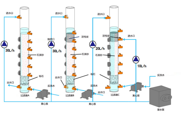 試驗裝置如圖1所示,主體結(jié)構(gòu)采用有機玻璃制成,內(nèi)徑70mm,高度2000mm。過濾器包括進(jìn)水管、出水管、反沖洗水管、支撐層和過濾介質(zhì)層。200毫米高的支撐層由礫石制成。粒徑為0.5-1mm,和分別為1-2mm,過濾層的填料為石英砂和椰殼活性炭。過濾器A的填料層為1000mm石英砂。過濾器B、C的填料層均為上層200mm椰殼活性炭和下層800mm石英砂。根據(jù)水廠的設(shè)計規(guī)范,過濾器的過濾速度為8m/h,進(jìn)水流量為30L/h。過濾器A和B為單點進(jìn)水,過濾器C為兩點進(jìn)水,兩個進(jìn)水點分別位于過濾器頂部和20cm深度處;第一進(jìn)水點流量為20L/h,第二進(jìn)水點流量為10L/h。過濾器A和B是過濾器C的空白對照。過濾器每24小時反洗一次。