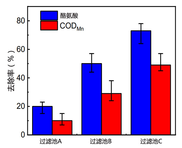 活性炭濾池出水二氯乙腈前體酪氨酸和CODMn的平均去除率如圖2所示。實驗過程中,三個活性炭過濾器出水酪氨酸濃度依次下降:過濾器C(73%)>過濾器B(50%)>過濾器A(20%)(p<0.05)。生物濾池出水的酪氨酸濃度低于進(jìn)水。誰記錄了飲用水處理廠生物過濾后出水中DON濃度的增加,表明DON總體出水濃度的變化并不代表個體的變化,而是過濾器中不同個體的變化規(guī)律也不同。平均出水CODMn去除率的變化趨勢與平均出水酪氨酸去除率一致。CODMn去除率可以反映生物濾池中有機物的去除情況。酪氨酸是一種有機物,其分子結(jié)構(gòu)中含有還原性酚羥基和氨基,可被高錳酸鉀氧化。因此,CODMn去除率也可以作為酪氨酸去除的依據(jù)。