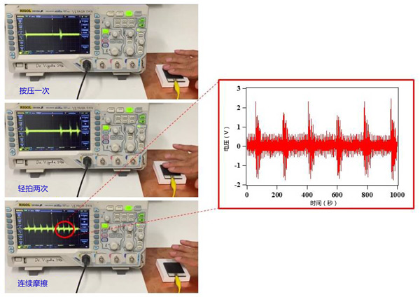 圖4:在單電極配置下使用手指輕敲和生成的電壓信號的插圖演示了活性炭制造的發(fā)電機(jī)運(yùn)動(dòng)傳感應(yīng)用。