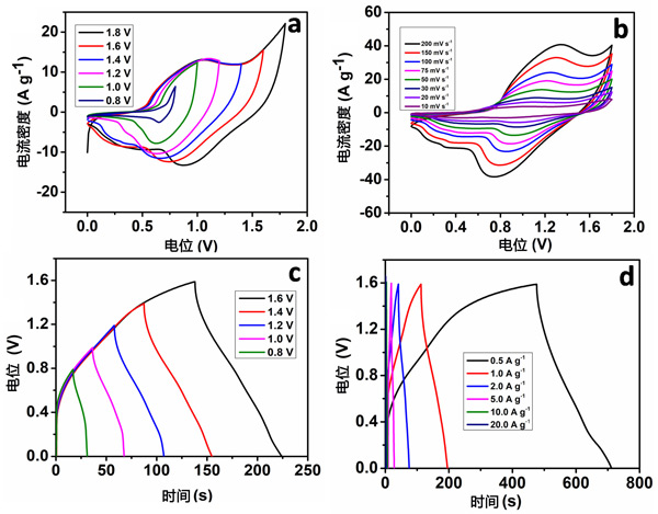 超級電容器裝置的制造是集成陰極(氧化鎳),陽極(活性炭)使用纖維素濾紙(在2.0M/KOH電解液中浸泡放置)分離,然后用絕緣膠帶包裹。陽極和陰極具有相似的幾何表面積,再經過合適的重量比來制成電容器。圖2a顯示了超級電容器件在各種截止區(qū)域中的CV曲線,掃描速率為50mVs-1。從圖中可以看出,電容器件的CV曲線呈現(xiàn)出典型的準矩形電容性能,這對應于雙電層電容器和贗電容的相互貢獻。此外,當增加工作截止區(qū)時,會發(fā)生更多的法拉第電化學反應。當工作電位超過1.7V時,也會在CV曲線上注意到氧氣的釋放。活性炭/氧化鎳器件很大程度上取決于截止區(qū)域。因此,選擇1.6V作為隨后研究超級電容器件電化學性能的潛在窗口區(qū)域。圖2b顯示了活性炭電容器件在0到1.6V的截止區(qū)域內的各種掃描速率下的CV曲線。電流密度隨著掃描速率的增加而增加,并且氧化峰電位轉移到更正的電位,類似三電極器件的結果。