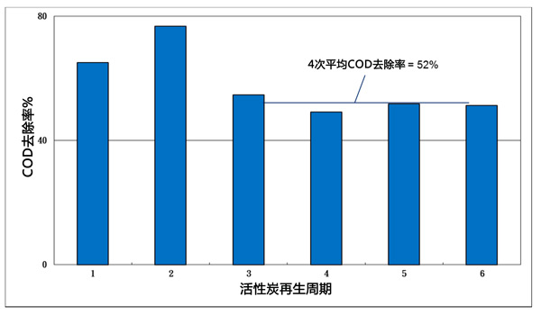 圖2:COD去除百分比與活性炭再生次數(shù)的關(guān)系圖。