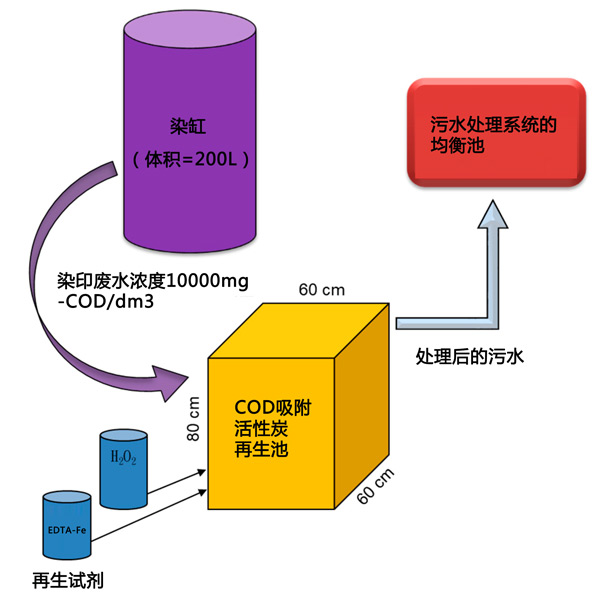 根據(jù)獲得的數(shù)據(jù)和當(dāng)前的紗線染色工藝,使用所提出的兩步處理系統(tǒng)處理來自常用的200L染浴的高COD染色廢水看起來適用,并提出了建議如圖3所示。據(jù)我們所知,目前運(yùn)營的染色設(shè)施中沒有這種建議的設(shè)置。設(shè)計(jì)容積(即200L)足以容納一批染缸出水,使高COD廢水可直接進(jìn)入擬建裝置的吸附和再生。根據(jù)結(jié)果,去除50-60%的COD將大大減少回流到平衡罐的COD,從而避免現(xiàn)有廠內(nèi)生物處理單元的過載情況。為了運(yùn)行所提議的裝置,首先,將來自染色池的一定量的高COD廢水引導(dǎo)至充滿指定活性炭的反應(yīng)單元(如果處理120L廢水,則為20kg)進(jìn)行24小時(shí)吸附。由于結(jié)果表明染浴出水COD在酸性pH值下吸附更多,二是對處理后的廢水進(jìn)行篩分,24小時(shí)后排至其廢水處理設(shè)施的頭部(即平衡池)。第三,分別串聯(lián)添加初始濃度為2.12mmol/dm3和2.5%的乙二胺四乙酸鐵鈉和過氧化氫,以啟動(dòng)活性炭再生1小時(shí)。從連續(xù)運(yùn)行來看,兩步法處理高COD染色廢水的應(yīng)用前景看好。然而,我們確實(shí)注意到該技術(shù)的當(dāng)前應(yīng)用可能僅限于染浴設(shè)計(jì)及其操作。染浴的高COD流出物發(fā)生在染色過程的第一次排放,但對于大多數(shù)可用的染浴操作,根據(jù)不同的COD濃度對每批流出物進(jìn)行分離是不適用的。一些染色裝置或染色工藝的改造被認(rèn)為是必要的。