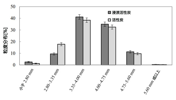 在一系列實(shí)驗(yàn)中使用了用碘酸和無機(jī)酸浸漬的顆;钚蕴。根據(jù)測(cè)量粒度分布、堆積密度和甲苯吸附能力,和測(cè)量浸漬活性炭的pH值。粒度按篩子大小分類。通過測(cè)量包裝在200mL容器中的浸漬活性炭的重量來計(jì)算堆積密度。通過將1/10甲苯蒸氣流到10g浸漬活性炭中,測(cè)量甲苯蒸氣吸附前后的重量差,計(jì)算出甲苯吸附容量。將3g浸漬活性炭加入300mL離子交換水中并搖動(dòng)30分鐘,制成活性炭樣品再進(jìn)行pH測(cè)量。圖1顯示了浸漬活性炭和活性炭的粒度分布。對(duì)于浸漬活性炭和活性炭,粒徑均為2.80-5.60毫米。這些粒徑通常是氣體處理的值。通過浸漬,堆積密度增加,甲苯吸附能力降低。這可能是由于浸漬材料滲入了孔隙。由于金屬的雜質(zhì),活性炭的pH值呈堿性。由于酸解離,通過浸漬降低了pH值。
