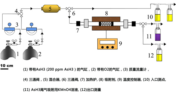 實驗裝置的方案在圖1提供。將氣流以200mL/分鐘的氣體流速引入混合器中。該氣體由稀釋在O2(0-1.2%)中的AsH3(200ppm)組成。然后預(yù)混合氣體進入填充有0.2g活性炭吸附柱的固定床。設(shè)置兩個采樣口:一個用于進口氣體,一個用于出口處理后的殘余尾氣。廢氣經(jīng)酸性KMnO4處理。在這項研究中,AsH3去除效率和吸附容量用于評估活性炭的砷吸附能力。所有實驗重復(fù)3次,計算標(biāo)準(zhǔn)差和平均值。