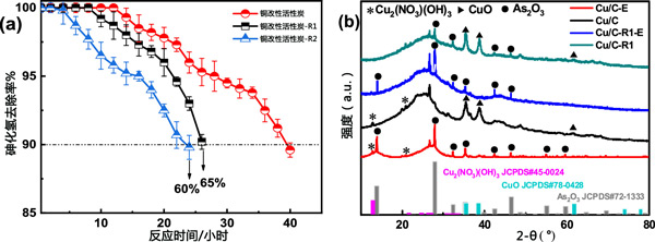 銅改性活性炭通過水洗和吹掃氣體法進行再生。為此,活性炭樣品首先在100℃的熱空氣中活化3小時。然后用去離子水浸泡清洗4-5次,放入電熱風(fēng)烘箱中110-120℃烘干。之后,將樣品置于氮氣氣氛下的管式爐中,并使用程序升溫控制器升高溫度?紤]到通過在180℃下烘烤獲得的材料,溫度首先設(shè)定在20-180℃。之后,停止加熱,將樣品冷卻至室溫。取出樣品,停止氮氣流,對再生材料進行測試。如圖3a所示,R的再生效率(R為再生吸附劑與新鮮吸附劑的穿透時間之比)在一個再生循環(huán)后為65%。在第二次再生循環(huán)后,樣品恢復(fù)效率R達到60%,證實了活性炭吸附劑對去除AsH3具有合理的再生能力。為了確定活性炭吸附劑再生后表面相的變化,通過XRD分析活性炭吸附劑。如圖3b所示,再生后活性炭-R1中35.6°、38.8°和61.8°的CuO衍射峰強度明顯增加,但沒有Cu2(NO3)峰被找到。這表明在再生過程中回收的一些CuO物種可能被中間體Cu2(NO3)(OH)3轉(zhuǎn)化。此外,活性炭-R1樣品中As2O3在28.0°、32.2°、35.5°、42.6°、46.4°、55.0°和59.6°處的結(jié)晶峰明顯減弱。推測中間體Cu2(NO3)(OH)3向吸附活性中心CuO的轉(zhuǎn)變和結(jié)晶As2O3的分離可能是活性炭吸附劑再生性能好的原因。