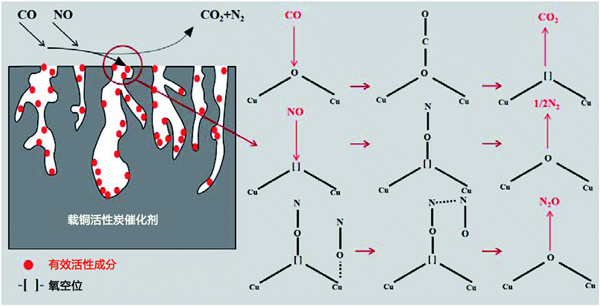 在活性炭催化劑表面通過選擇性催化還原技術(shù)(CO-SCR)反應(yīng)進(jìn)行的低溫脫硝是一種具有代表性的非均相催化體系,遵循Langmuir-Hinshelwood反應(yīng)機(jī)理。因此,提出了圖3所示的脫硝機(jī)制,用于在活性炭催化劑上對NO進(jìn)行CO還原;钚越M分Cu均勻分散在活性炭上,增加了催化劑的比表面積和對NO和CO的吸附。這一結(jié)論表明Cu均勻分布在活性炭催化劑的表面,將脫硝效率提高到80%。CO吸附在催化劑表面以還原-O-Cu2+到=Cu+并生成CO2。吸附的NO解離成N和O,解離的N原子與NO分子結(jié)合形成N2O。據(jù)報(bào)道,NO的解離是CO誘導(dǎo)的NO消除的關(guān)鍵步驟;钚晕稽c(diǎn)的釋放促進(jìn)了CO的吸附,最后N2O和=Cu+反應(yīng)生成N2和–O–Cu2+,這進(jìn)一步促進(jìn)了脫硝反應(yīng)。在CO與NO的反應(yīng)中,Cu2+↔Cu+交換可能會(huì)改變催化劑表面的價(jià)態(tài),更多的氧空位可用于轉(zhuǎn)化過程,促進(jìn)NO向N2的轉(zhuǎn)化。