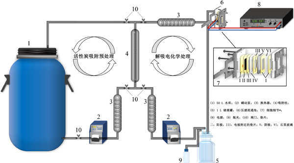 制備含有300mg/L-1苯的甲醇溶液和含有50mmol/L-1電解質(zhì)(H2SO4)的水介質(zhì),以確定污染物的去除效率。初始pH值約為1.5,在電化學(xué)過(guò)程測(cè)試期間未觀察到顯著變化。使用包含電極作為陽(yáng)極和鈦板作為陰極的單隔室壓濾流動(dòng)池(在圖1中詳細(xì)表示)進(jìn)行電解,其具有13.5cm2的明顯幾何面積。兩個(gè)電極由墊片隔開(kāi),距離為4毫米。使用含有1L溶液的夾套玻璃容器,蠕動(dòng)泵以1L/min-1的速度將溶液泵入熱交換器,然后循環(huán)通過(guò)電池。使用恒溫浴將溫度控制在25℃。在恒電流模式下以50mA/cm-2的電流密度進(jìn)行電解。使用前,將陽(yáng)極在H 2 SO4/0.05mol/L-1溶液中以40mA/cm-2極化20分鐘, 以從其表面去除任何雜質(zhì)。電化學(xué)實(shí)驗(yàn)一式三份進(jìn)行。