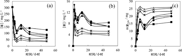 圖2:苯濃度隨水溶液(a)氣相苯濃度 (揮發(fā)) (b) 和吸附在活性炭中的苯質(zhì)量 (c) 在不同活性炭的水溶液中的吸附測(cè)試期間衰減。