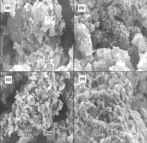 圖3:吸附前后的顯微照片,a活性炭、b堿處理的活性炭、5,000倍,c吸附后的活性炭和d吸附后的堿處理活性炭放大1000倍。