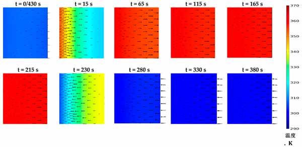 活性炭復合吸附劑的壓力和溫度決定了平衡吸收,它代表了在給定時間分別在吸附和解吸階段可以達到的最大和最小吸收容量。然而,顆粒內(nèi)和顆粒間的傳質(zhì)阻力表明吸附材料在每種給定情況下可以多快達到其平衡吸收能力。這突出了在本研究中同時求解兩種傳質(zhì)機制與其他控制方程的重要性,以顯示促進傳熱對傳質(zhì)的凈效應(yīng)。圖2顯示了在430秒循環(huán)時間內(nèi),考慮到預熱和預冷階段均為30秒的時間間隔內(nèi)代表性部分的固結(jié)吸附劑域的溫度分布。