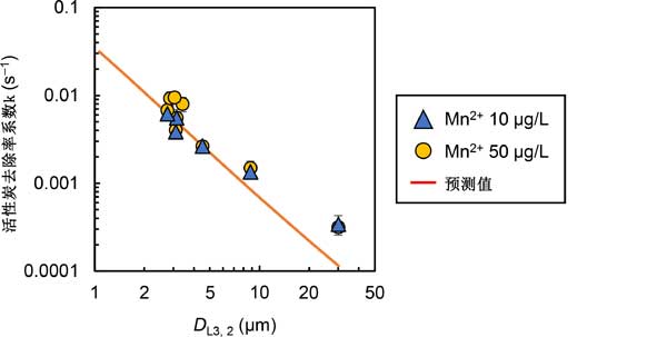 我們將Mn2+去除率系數(shù)(k)與活性炭的粒徑進行了比較(圖3)。我們使用源自相同活性炭的九種尺寸的碳顆粒繪制了實驗數(shù)據(jù),以便與方程式的預測進行比較。實驗值和預測值幾乎一致,并且在雙對數(shù)圖上都顯示出線性關(guān)系。仔細觀察發(fā)現(xiàn),預測值的斜率比實驗值更陡,在較大顆粒范圍內(nèi),實驗值略大于預測值。這可能是由于顆粒形狀或表面性質(zhì)的任何差異:我們假設了一系列參數(shù)值,包括球形值,這些預測與顆粒大小無關(guān),但在實際的活性炭中,這些值可能隨顆粒大小而變化?傮w而言,活性炭的粒徑對Mn2+去除性能有很大影響。