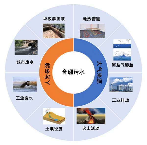 硼通過(guò)礦物提取、煤炭燃燒、含硼砂產(chǎn)生的清潔劑的廢水排放、硼肥等應(yīng)用以及硼化物處理的木材的副燃燒進(jìn)入水環(huán)境(圖1)。由于人類活動(dòng)的影響,已經(jīng)觀察到地下水和地表水中的硼濃度增加。硼在水生環(huán)境中的存在會(huì)對(duì)環(huán)境造成很大的影響。但從工業(yè)設(shè)施對(duì)硼的需求增加,水資源中硼的含量增加,水質(zhì)標(biāo)準(zhǔn)變得更加嚴(yán)格。所以需要去除水中的硼來(lái)修復(fù)環(huán)境。脫硼方法包括膜分離、活性炭吸附、(電)凝聚和沉淀、萃取以及這些方法的組合。