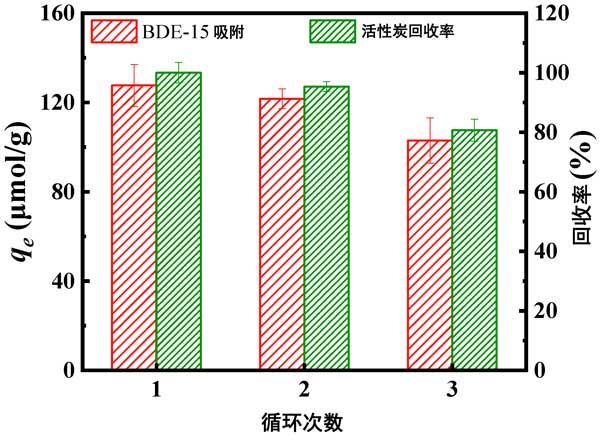 為研究活性炭處理洗脫液后的循環(huán)利用性能,采用甲醇洗脫活性炭進行再生回用。如圖3所示,在三個回收-吸附循環(huán)中,活性炭的吸附量略有下降,活性炭的吸附量保持在103μmol/g以上,下降了25μmol/g(下降了19%)。活性炭表現(xiàn)出良好的可回收性和可重復(fù)使用性,有利于實際應(yīng)用。