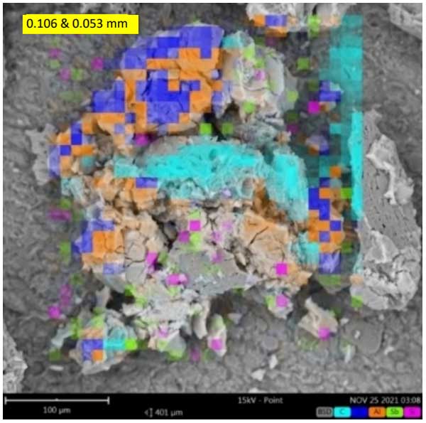 水性介質(zhì)最終溶液中的元素通過測定。溶液中存在的元素可以來自電極氧化、活性炭孔隙中的元素提取以及水介質(zhì)中使用的硬水中的元素。在測試中,由于電凝過程中的廣泛氧化,F(xiàn)e水平低于Fe量化限值(0.01mg/L)。使用0.106毫米大小的活性炭顆粒的電凝工藝在鋁電極上實現(xiàn)了比鐵電極更均勻的涂層,如750倍和600倍放大率下的活性炭顆粒的SEM圖像所示(見圖1);钚蕴拷Y果中存在的多元素在王水中消解并通過ICP-OES表征,通過電極的氧化、活性炭顆粒的凝聚和水介質(zhì)硬水中所含金屬的吸附而增加。
