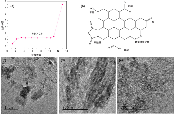 圖1:活性炭載體的研究:(a)零電荷點(diǎn)(PZC)的測定:反應(yīng)24小時后所得pH值作為起始pH值的函數(shù)。(b)不同含氧基團(tuán)。