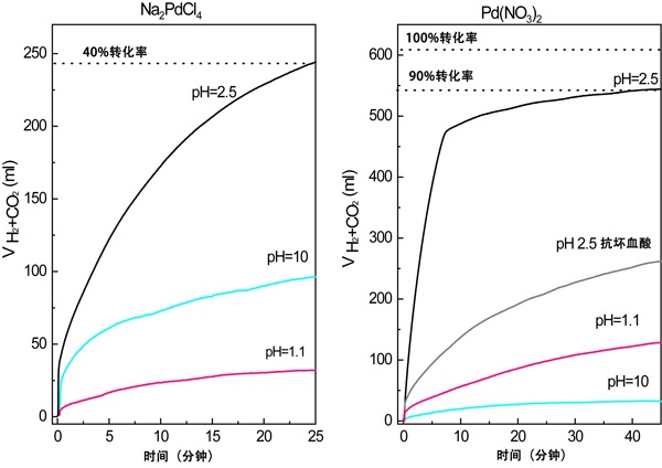 兩種不同的Pd前驅(qū)體在不同浸漬pH下制備的活性炭催化劑在60℃時產(chǎn)生的重整氣體(H2+CO2)的體積隨時間的變化曲線圖在圖2顯示。由于甲酸鈉添加劑對甲酸脫氫的促進(jìn)作用,催化測試在存在的情況下進(jìn)行]。所有制備的樣品都顯示出研究反應(yīng)的活性。正如在當(dāng)前測試條件下所預(yù)期的,曲線的形狀遵循甲酸中的一級動力學(xué)。為了更好地理解析氫曲線,我們測量了不同階段的反應(yīng)pH值:分散催化劑和甲酸鈉在60℃攪拌30分鐘后,注入甲酸后,當(dāng)反應(yīng)開始時和使用Na2PdCl4制備的催化劑系列反應(yīng)25分鐘后和Pd(NO3)2系列反應(yīng)40分鐘后,根據(jù)圖7所示的曲線。表明在所有樣品的反應(yīng)過程中,甲酸+甲酸鈉緩沖液的初始pH值保持不變,除了使用Pd(NO3)2制備的樣品,在pH值2.5下浸漬并用銻還原。對于該樣品,反應(yīng)40分鐘后的pH值為8.2,表明緩沖條件的喪失和甲酸的總消耗量與實(shí)現(xiàn)的90%甲酸轉(zhuǎn)化率一致。對于該系列的其余部分,pH測量值表明甲酸并未完全消耗,這與實(shí)現(xiàn)的轉(zhuǎn)化率一致。