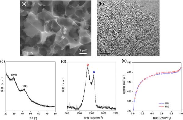 圖1:所制備活性炭的表征結(jié)果:(a)FE-SEM和(b)高分辨率TEM圖像、(c)XRD圖、(d)拉曼光譜和(e)N2吸附/脫附等溫線(xiàn)。