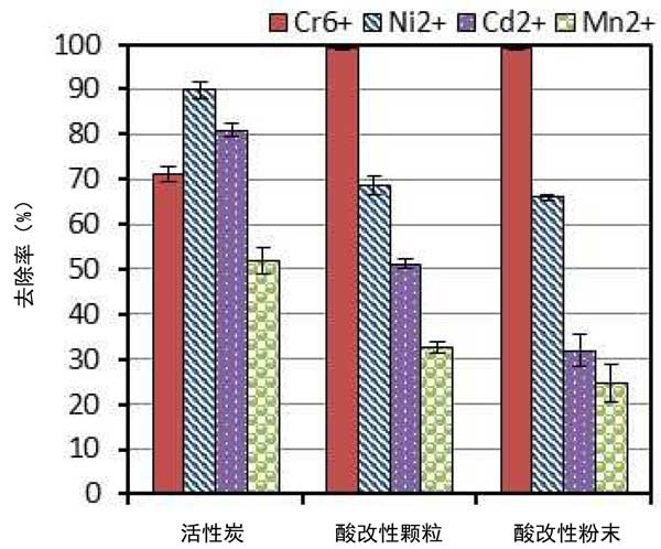 顆;钚蕴康乃崽幚砼c未處理的活性炭相比,Cr6+去除效率提高了30%,而Ni2+、Mn2+和Cd2+分別降低了23%、36%和37%。這可以通過與其他離子相比更高的離子勢和Cr6+的小尺寸來解釋。這將導(dǎo)致Cr6+對酸性表面基團(tuán)的吸引力更強(qiáng),并更快地擴(kuò)散到活性炭的孔隙中。高正電的Cr6+離子會吸附在孔隙邊緣的酸性功能位點(diǎn)上,排斥其他較弱的重金屬離子,降低它們對活性炭孔隙的可及性。