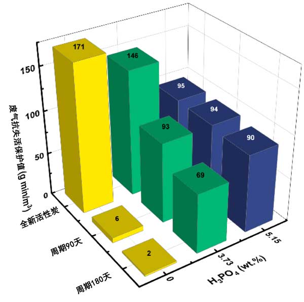 可以看出,濃度為5.15wt.%的磷酸對于抑制失活非常有效(加速失活6個(gè)月后保護(hù)值保持不變)。然而,添加5.15wt.%磷酸后,初始保護(hù)值(對于新碳)顯著降低,從171g/min/m3降至95g/min/m3?傮w而言,磷酸是不如NaH2PO4有利的添加劑。