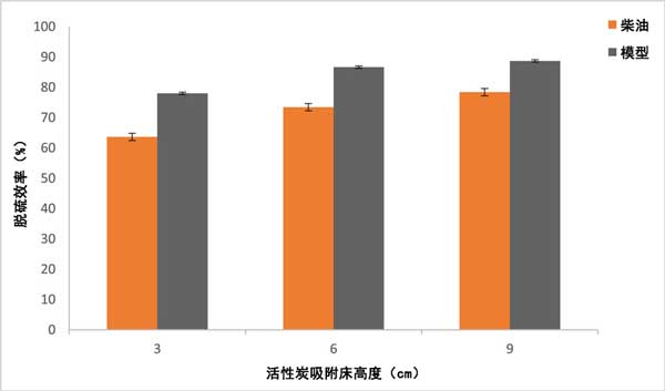 柴油和模型柴油用作油原料,以評估活性炭和改性活性炭的脫硫工藝。柴油初始硫濃度為7510ppm。兩種柴油原料用于固定床吸附塔裝置的脫硫工藝。為了進(jìn)行脫硫?qū)嶒,使用計量泵將油原料送入塔中。采用垂直向下固定床吸附塔裝置連續(xù)吸附硫化合物,流量為1mLs-1。柱子逐漸裝載不同高度的活性炭層(3-9厘米),對應(yīng)于不同的活性炭重量(10、7和4克)。