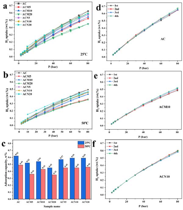 氫氣儲(chǔ)存材料在實(shí)際應(yīng)用中需要具備良好的循環(huán)性能。作者對AC、ACM10、ACN10等樣本進(jìn)行了若干次(例如10次或更多)吸附–解吸循環(huán)測試,以評估其穩(wěn)定性。原文圖2d、5e、5f展示了循環(huán)曲線。