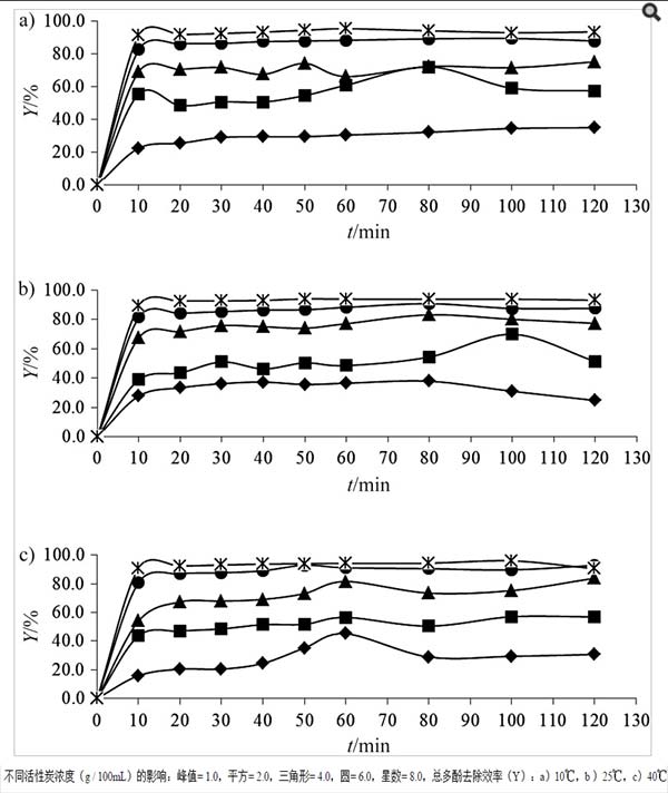 所用活性炭的濃度是控制吸附的重要因素。眾所周知,溫度是影響任何吸附過程的附加因素。因此,在三個(gè)不同的溫度,室溫(25℃),高于(40℃)和波紋管(10℃)下進(jìn)行測試。為了觀察溫度和吸附劑量對多酚吸附的同時(shí)影響,吸附劑濃度從1至8g / 100mL變化。使用相同數(shù)量的廢水(25mL)和恒定的酚濃度(3.0mg / mL)進(jìn)行不同的測試,但改變活性炭的量(0.25、0.5、1.0、1.5和2.0g)。在圖中可以觀察到不同溫度下的吸附趨勢。