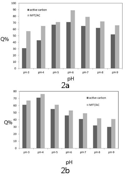 初始pH的影響:初始pH對鉻和鋅離子的去除效率的影響在pH(3-9)的范圍內(nèi)進(jìn)行研究,并在(圖2a和2b)中表示。通過在含有50mL初始濃度為100mg / L的50mL重金屬溶液的燒杯中,將0.05g MFT/活性炭或活性炭浸泡在25℃下,并且以210KHz聲強(qiáng)度,以7.7W /厘米1小時(shí)。如圖2所示,由于pH影響金屬離子和MFT官能團(tuán)的化學(xué)性質(zhì),MFT / 活性炭從水溶液中去除中的金屬離子是pH依賴性過程。在所有pH值范圍內(nèi),MFT / 活性炭的去除系數(shù)大于活性炭的去除系數(shù)。對于鉻離子,去除Cr 3+的系數(shù)離子從pH3增加到6,在pH6達(dá)到最大值。在pH = 6時(shí),約91%的鉻離子從溶液中去除。在pH范圍(7 - 9),去除系數(shù)略有下降。對于鋅離子,去除系數(shù)在pH4時(shí)達(dá)到最大值,鋅離子去除率達(dá)到74%,然后明顯下降。在中性或微酸性介質(zhì)中,吸收可能是由于樹脂 - 金屬離子絡(luò)合物的穩(wěn)定形成,由于配位羧酸根釋放H+,可能導(dǎo)致介質(zhì)酸度增加。在較高的pH值下,重金屬離子將水解成Cr(OH)+和Zn(OH)+,因此,重金屬正電荷減少到+1,這使得與螯合劑的低相互作用除了金屬氫氧化物可以沉淀。