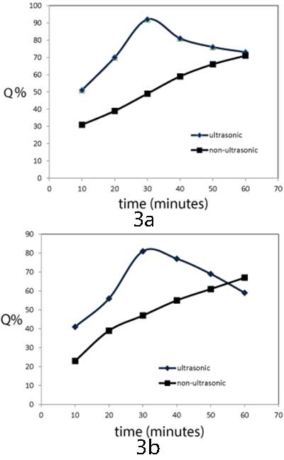超聲處理時(shí)間對鉻和鋅離子的去除效率的影響通過在存在和不存在的情況下將0.05g MFT / 活性炭與50mL Cr 3+和Zn 2+溶液(100mg / L)頻率為210kHz的超聲波,聲強(qiáng)為7.7W / cm。結(jié)果如圖3a和3b所示。