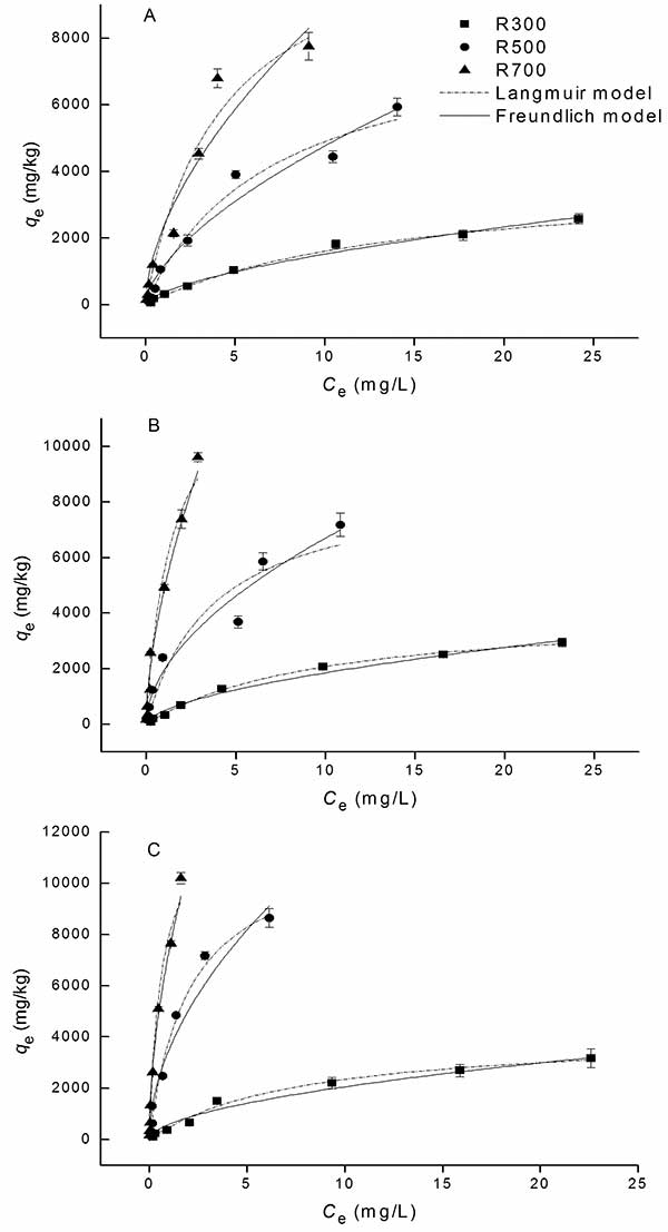 活性炭樣品上四環(huán)素的吸附等溫線如圖1所示。吸附數(shù)據(jù)顯示與Langmuir和Freundlich模型都很好,R 2系數(shù)高于0.919 。對于Freundlich模型中的參數(shù),不同樣品的n值相近(0.53-0.62),小于1,說明吸附是濃度依賴性過程。反映樣品吸收四環(huán)素能力的K f的值在700℃熱解產(chǎn)生的活性炭中最高。q max表示的趨勢Langmuir模型中的值也表明吸附容量隨著熱解溫度的增加而增加。計(jì)算最大吸附容量在大約11,834-14,157mg / kg的范圍內(nèi)。表面積是已知的是影響活性炭的吸附能力的一個(gè)重要因素,尤其在去除四環(huán)素的情況下。這在本研究中得到證實(shí),活性炭樣品的表面積(S BET)與q e值顯著正相關(guān)。在較高的熱解溫度下,活性炭樣品的表面積增加,吸附能力增加。