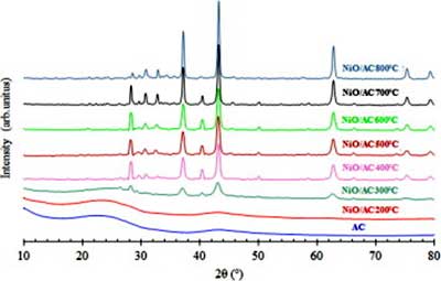 由活性炭和活性炭負(fù)載的鎳在不同的熱處理溫度下記錄的X射線衍射圖如圖1 所示。在200中被加熱的樣品 ℃,在2θ顯示有2個衍射峰 = 23.5和43.5°,對應(yīng)于(0 0 2),(1 0 無定形活性炭0)指數(shù)平面。另外,隨著煅燒溫度從300 ℃ 升高到800 ℃ ,反射次數(shù)增加,表明添加的催化劑在2θ = 37.1°,43.2°,62.7°和75.3° 處被氧化成氧化鎳 。這些角度分配給(1 1 1),(2 0 0),(2 2 0)和(3 1 1)面,立方晶體的氧化鎳。此外,對于400-800 ℃ 煅燒的樣品,在對應(yīng)于(2 2 2)的2θ = 79.3° 處觀察到新的峰。氧化鎳峰的強度也隨著煅燒溫度的增加而增加。