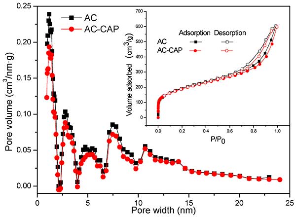 圖1.在氯霉素吸附之前活性炭的分子量 和N 2吸附/解吸等溫線(xiàn)(插入)和氯霉素吸附之后的活性炭?讖椒植加擅芏确汉碚(DFT)方法確定。