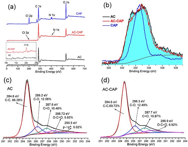 為了進(jìn)一步了解活性炭吸附氯霉素的機(jī)理,用XPS分析活性炭吸附前后的氯霉素(0.3 mmol / L)。圖2中示出了XPS測(cè)量光譜,活性炭吸附之前和之后的氯霉素的O 1s和C 1s峰。由C 1s譜確定的表面官能碳原子的計(jì)算相對(duì)含量也列于圖 2c,d中,并且計(jì)算的原子比率總結(jié)。主要的C 1s峰符合以下組的五條曲線(xiàn):286.6eV的石墨結(jié)構(gòu),286.2eV的CO(苯酚,醇或醚基),287eV的C = O(羰基和醚基),O = 288.7eV處的CO(羧基或酯基),并且在290.5eV處π->π*躍遷。