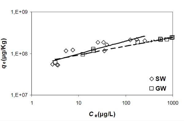 這次實(shí)驗(yàn)?zāi)康氖潜容^淡水和鹽水中活性炭去除菲的結(jié)果,因此不考慮來(lái)自水中其他有機(jī)化合物的競(jìng)爭(zhēng)(使用3.72的表面/孔擴(kuò)散流量比值,典型值為蒸餾水)。該通量比反映了與活性炭的內(nèi)孔相比,目標(biāo)化合物在活性炭顆粒的表面空隙中擴(kuò)散的情況。當(dāng)目標(biāo)化合物在其他競(jìng)爭(zhēng)化合物或天然有機(jī)物質(zhì)的存在下被吸附時(shí),將使用較低的值(例如0.4)。介紹了菲和活性炭在淡水和鹽水合成溶液中的吸附等溫線。兩個(gè)等溫線都是非線性的。Freundlich模型符合數(shù)據(jù),但它不是鹽水等溫線的最佳模型。它用于目前的工作中,以便將結(jié)果與之前的研究進(jìn)行比較,并且為了使用用于活性炭床模型的Freundlich常數(shù)。在圖1中,鹽濃度增加接近水溶性的菲的吸附(在Ce =180μg/ L時(shí),qe從1.9E + 8增加到2.2E + 8; + 15%),但是這種增加隨著菲濃度的降低而降低。在菲濃度約10μg/ L以下時(shí),當(dāng)溶液中存在鹽時(shí),吸附減少(qe從6.0E + 7降至5.4E + 7; - 10%)。對(duì)于淡水實(shí)驗(yàn),Vo計(jì)算的中孔體積的47%被測(cè)量為470-490cm3 / kg ;贔reundlich模型,Kfr表示為每孔活性炭孔體積的菲吸附量等于52%。