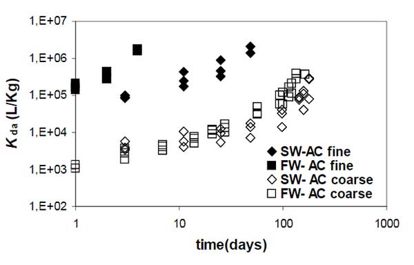 圖2:活性炭樣品吸附菲的時(shí)間。兩個(gè)不同的粒子直徑記錄(活性炭:2毫米,活性炭:0.25-0.06毫米)。