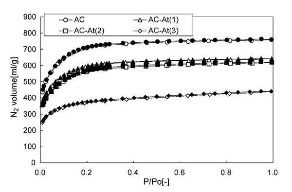 圖1.酸處理的活性炭的N2吸附/解吸等溫線(xiàn):開(kāi)放:吸附,閉合:解吸。
